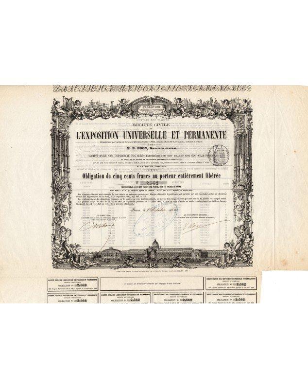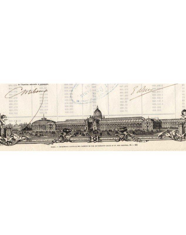 Extract from the statutes on the back: The purpose of the company founded in 1802 was to open a credit facility of 7,500,000 francs for the benefit of the Civil Society of the Palace of the Universal and Permanent Exhibition.