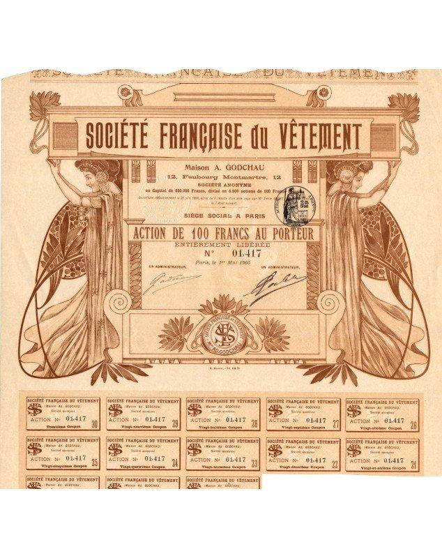 Share to bearer of 100 francs issued in Paris in 1905, part of an issue of 6,500 shares.