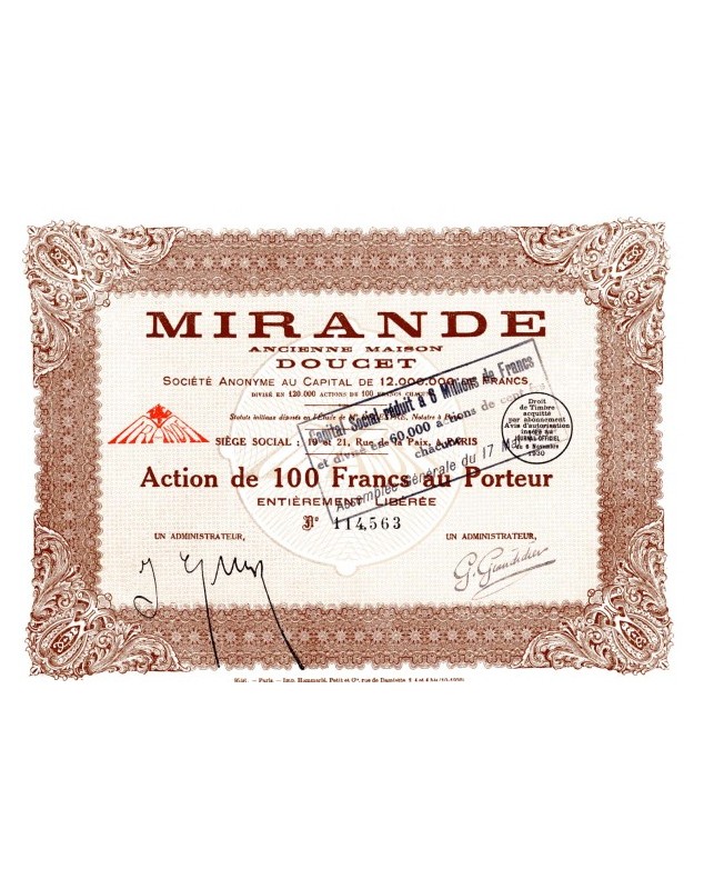100-franc bearer share issued in Paris in 1934, with a capital increase stamp dating from 1934.