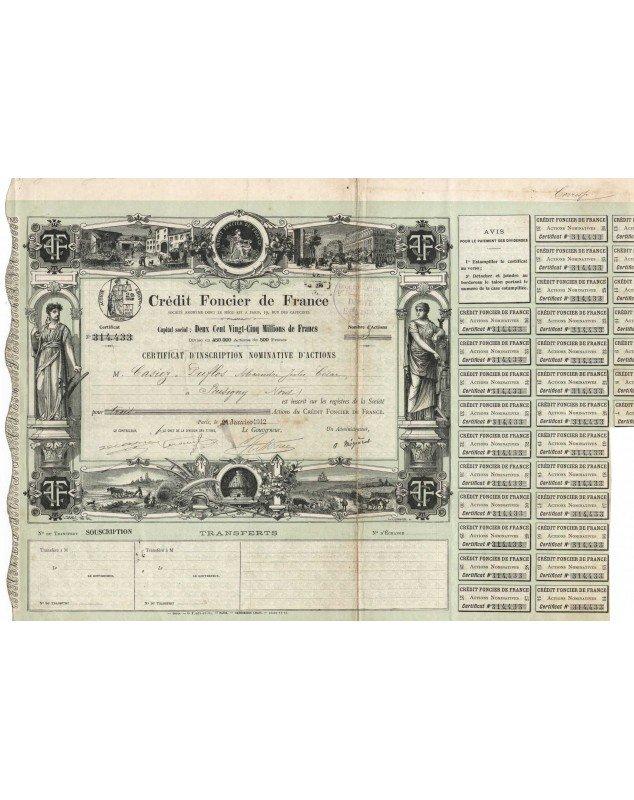 Limited company with an initial capital of 25 million francs founded in 1852 under the name of Banque Foncière de Paris by Xavier Branicki (1816-1879). The name became Crédit Foncier de France the same year. Louis Wolowski, a Polish naturalized Frenchman, was its general manager until 1854.