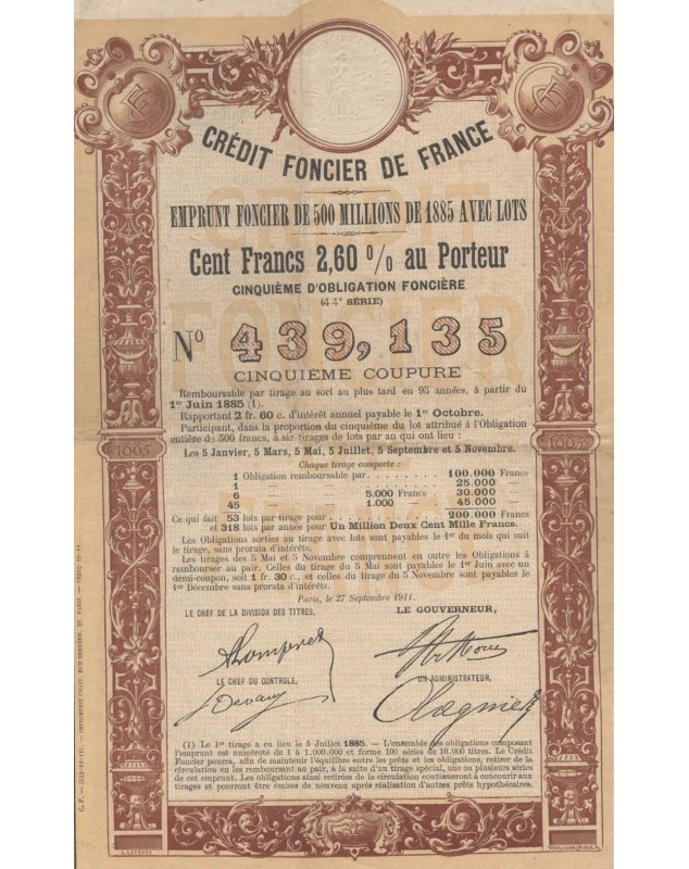Crédit Foncier de France - 2.6% 500 Millions Loan 1885