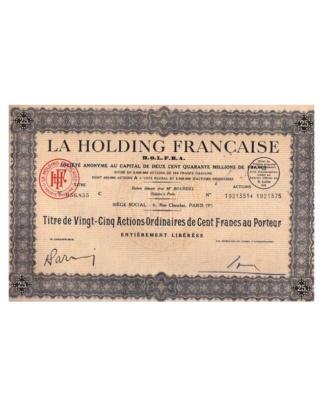 Cert. of 25 Ordinary Shares of 100F - Paris 1929