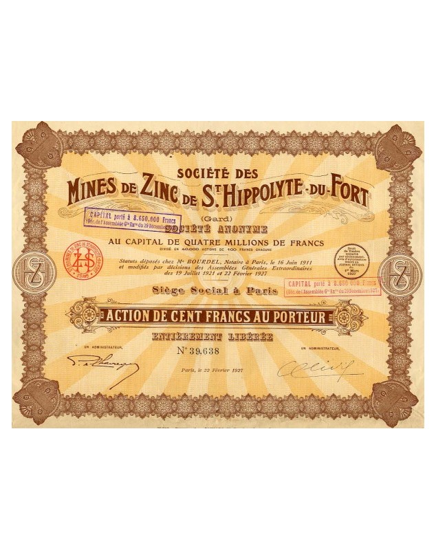 Sté des Mines de Zinc de St Hippolyte-du-Fort (Gard). 1927