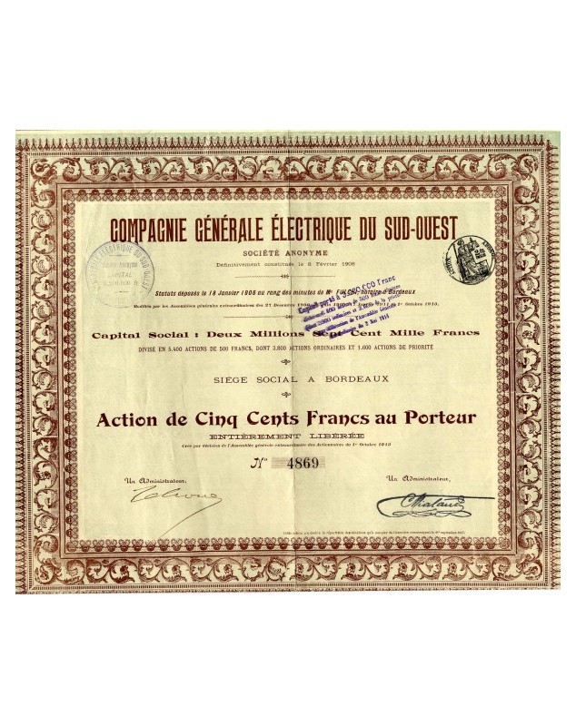 Share of 500 francs to bearer issued in Bordeaux in 1913.