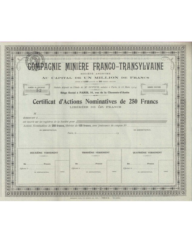 Certificate of Nominative Shares of 250F - Paris Unissued