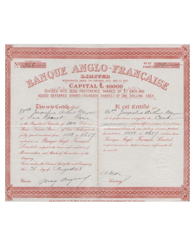 Certificate of 100 deferred Shares of 1 Shilling - 1908