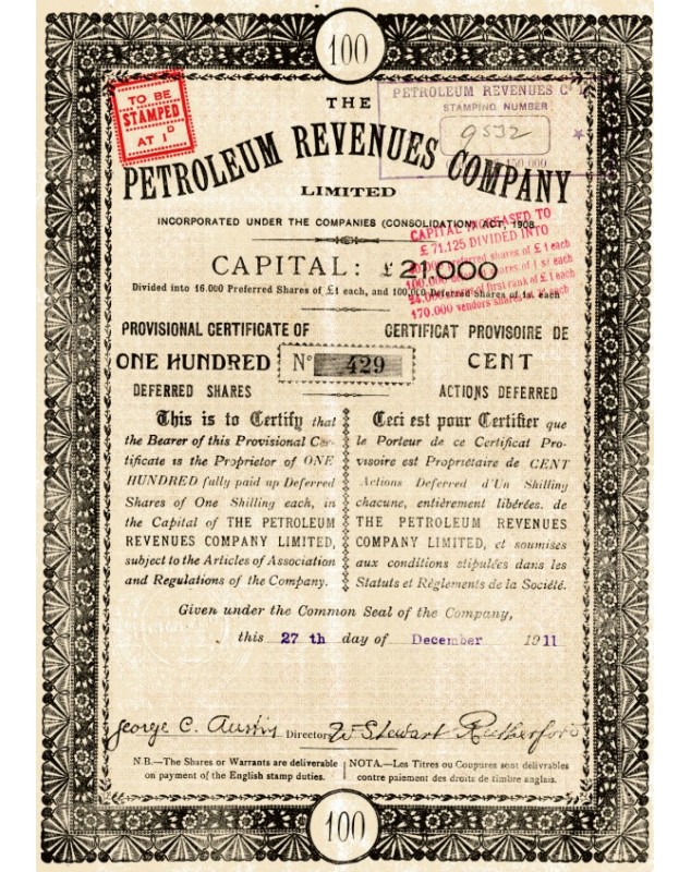 Provisionnal Cert. of 100 Preferred Shares of 1£ each - 1911