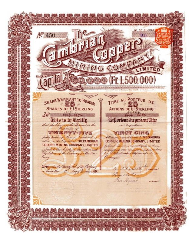 Certificate of 25 shares of 1£ each issued in London in 1900.