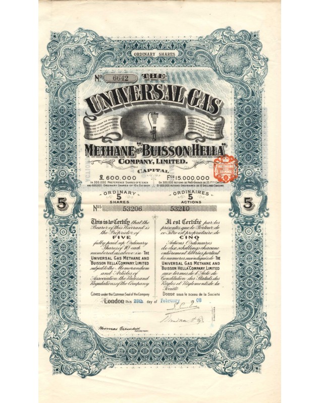 Certificate of 5 ordinary Shares of 10 Shillings issued in London in 1908 but Activities in Paris.