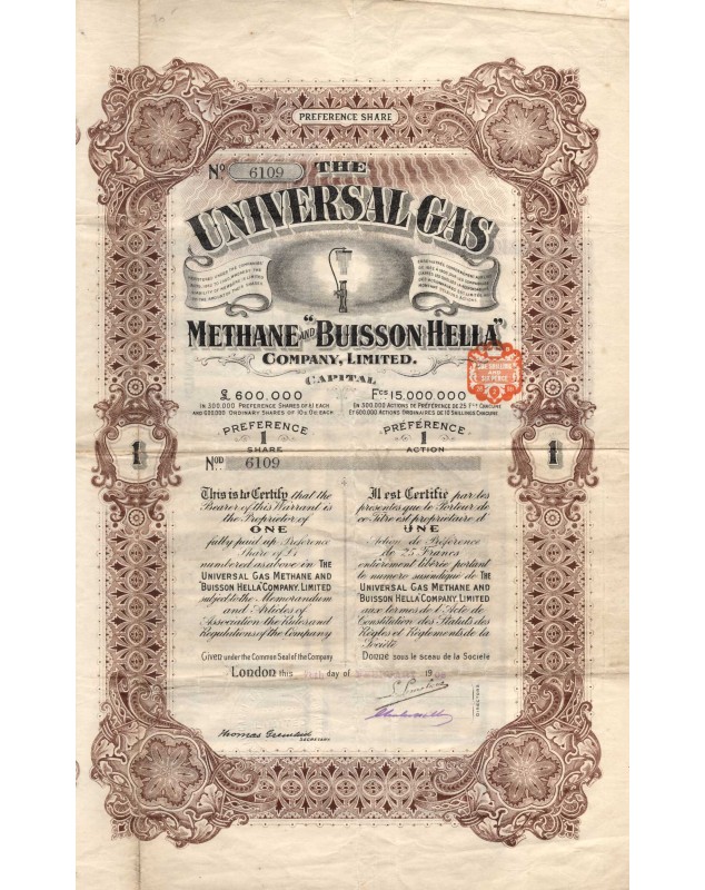 Certificate of One Preference Share of 10 Shillings issued in London in 1908 but Activities in Paris.