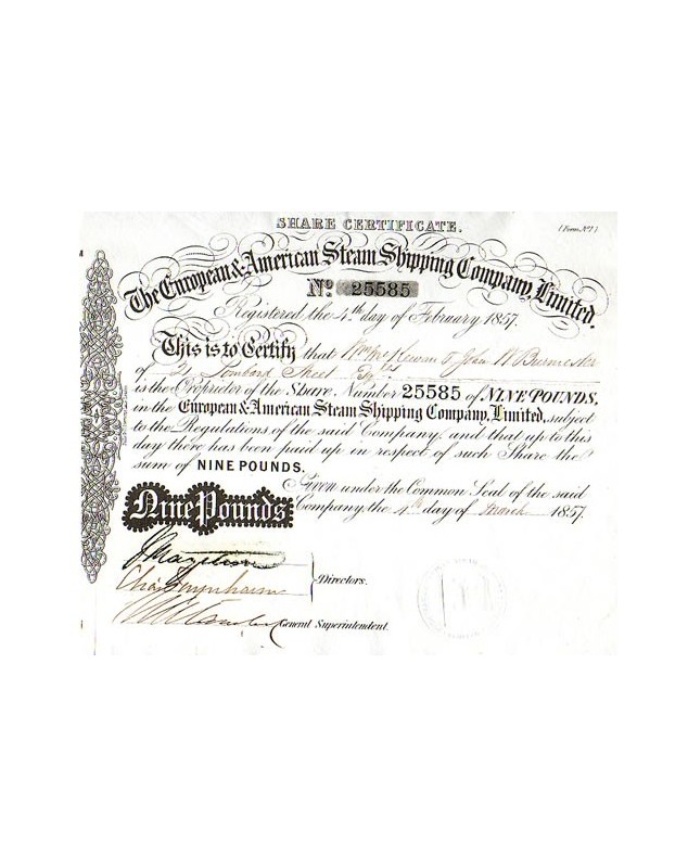 The European & American Steam Shipping Company was founded in 1857 with the purchase of eight iron screw steamers from the General Screw Steam Shipping Company, which were paid for with shares in the new concern. The new company was managed by T.R. Croskey, American Consul at Southampton. Four of the ships the GOLDEN FLEECE, HYDASPES, CALCUTTA and the LADY JOCELYN were used for a service to South America, and the remainder the QUEEN OF THE SOUTH, INDIANA, ARGO and JASON were placed in a fortnightly service between Bremen, Southampton and New York. The service from Europe to North America was merely a repetion of the General Screw Steam Shipping Company and the QUEEN OF THE SOUTH, INDIANA, ARGO and JASON in that order sailed between Bremen, Southampton and New York at fortnightly intervals starting on 25 April 1857. The sailings were interspersed between those of the wooden paddle steamers of the American owned Ocean Navigation Company and the New York & Havre Steam Navigation Company on the New York - Southampton - Le Havre route.
