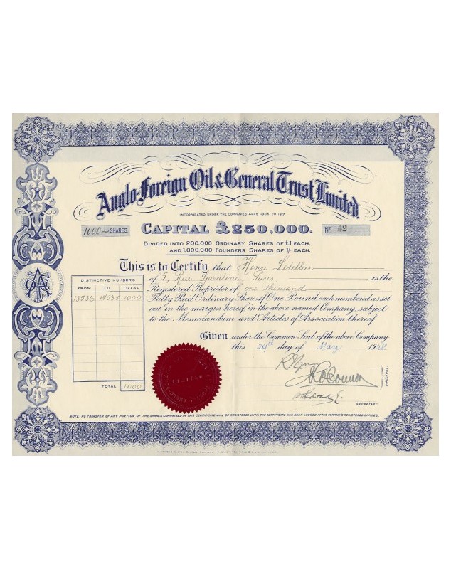 Certificate of 1000 shares of 1£ each - London 1928
