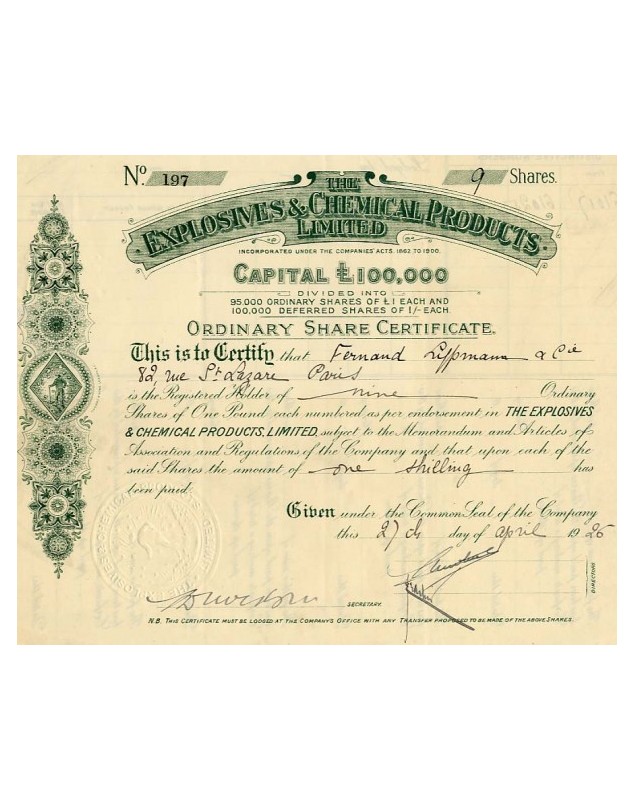 Certificate of 9 ordinary Shares of £1 each - 1926