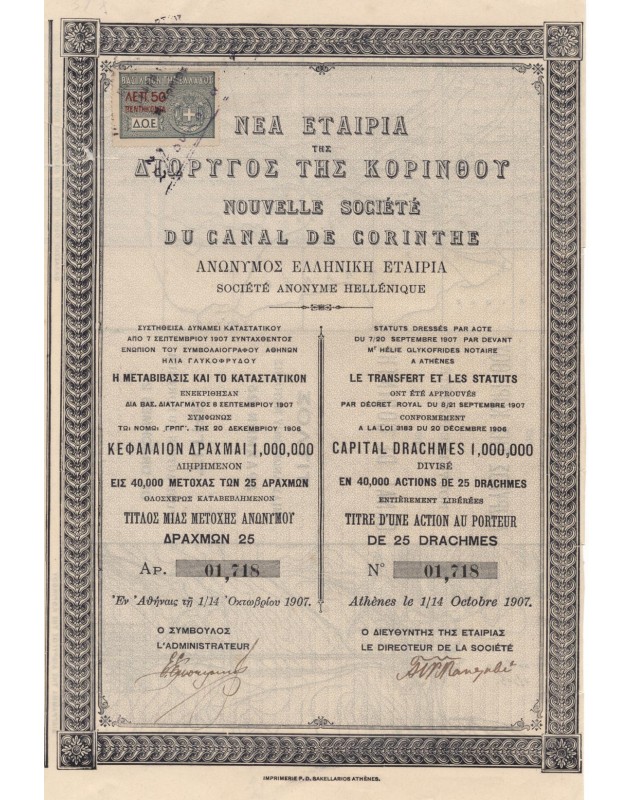 Certificate of 1 Share of 25 Drachmes - Athènes 1907