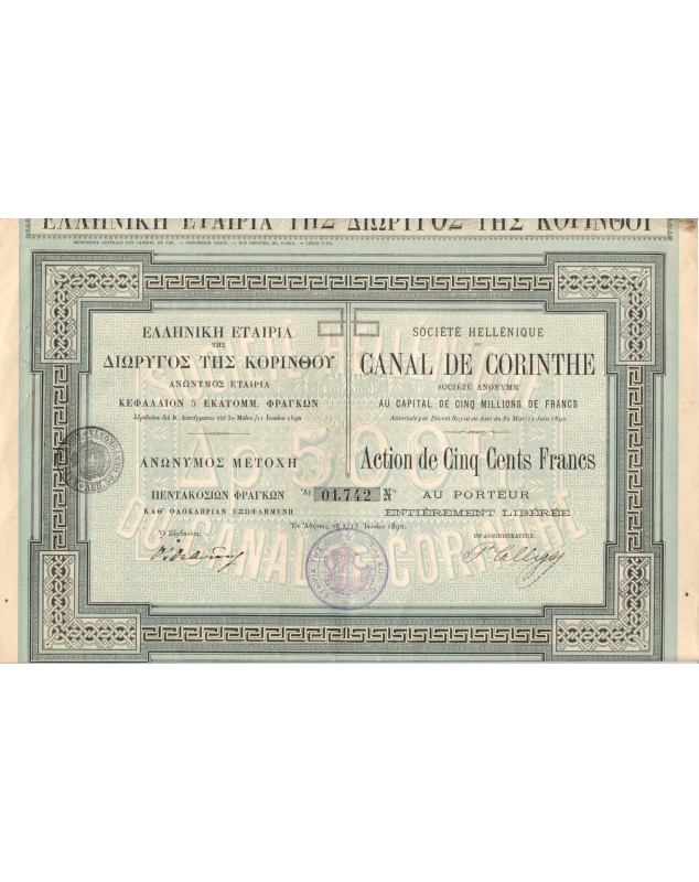 The purpose of the company was the completion and operation of a maritime canal of great navigation through the Isthmus of Corinth, the concession of which resulted from a royal decree of 1881. The concession had been granted to General Turr who had transferred it to the French Company, known as the Société Internationale du Canal Maritime de Corinthe (International Company of the Corinth Maritime Canal). This company, established in 1882, with a capital of 30 million, was dissolved and put into liquidation in 1890. This new company follows.