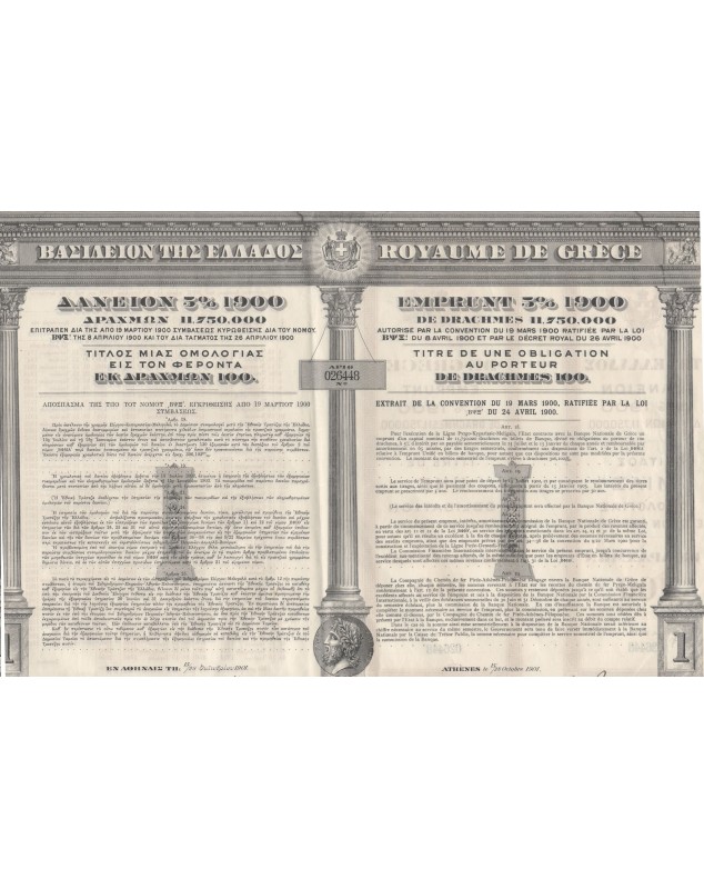 Certificate of 1 Bond of 100 Dr - Athens 1901