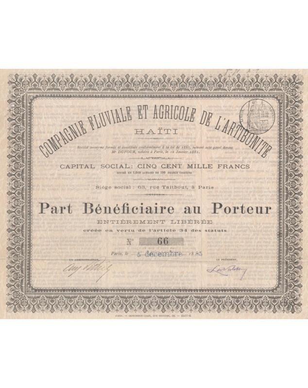Extract from the statutes on the back of this rare document: "The purpose of the company was the creation of a steam navigation service on the Artibonite River in Haiti (formerly Santo Domingo), the agricultural and forestry exploitation of several concessions of state lands located on the banks of this river, the sale and trade of the said holdings and everything connected therewith. "