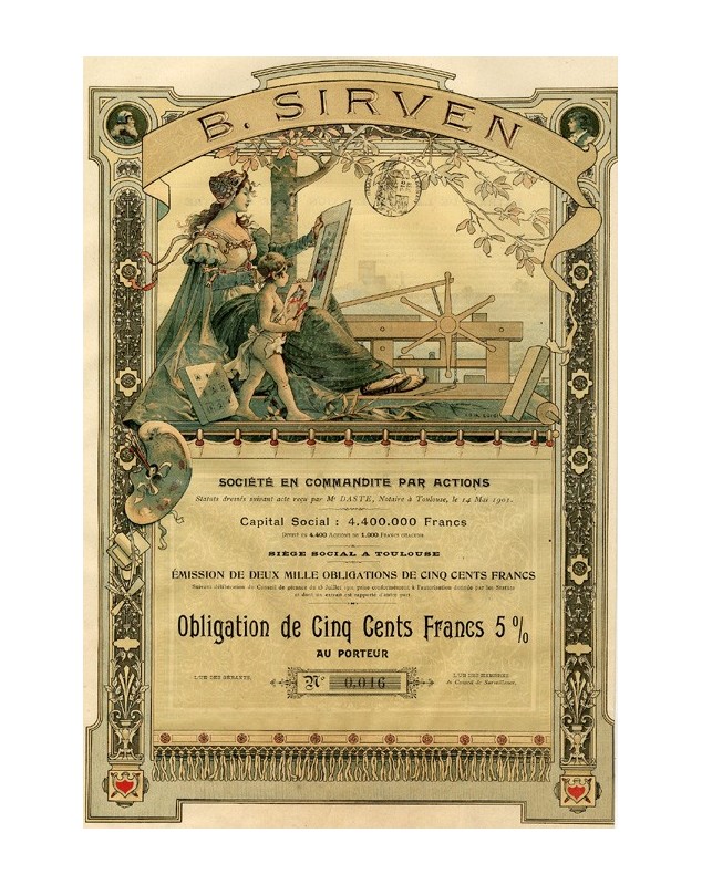Company founded by Bernard Sirven in 1834 in Toulouse, rue de la Colombette, specializing in lithography, but also binding, stitching, cardboard, office and school supplies.... Sirven also owned a cardboard factory .