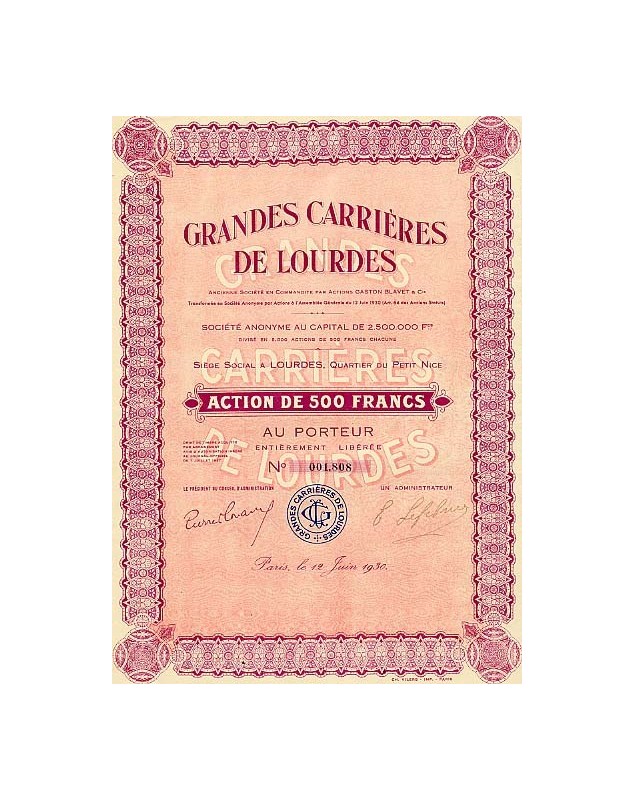 The headquarters of the Société des Grandes Carrières de Lourdes, former Gaston Blavet company, was initially located in Paris, 8 rue Madame, then 75 rue Saint-Lazare, then transferred to Lourdes, Quartier du Petit-Nice.