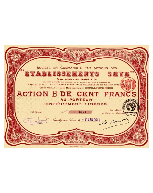 Share of 100 francs to bearer issued in Neuilly-sur-Seine near Paris in 1925.
