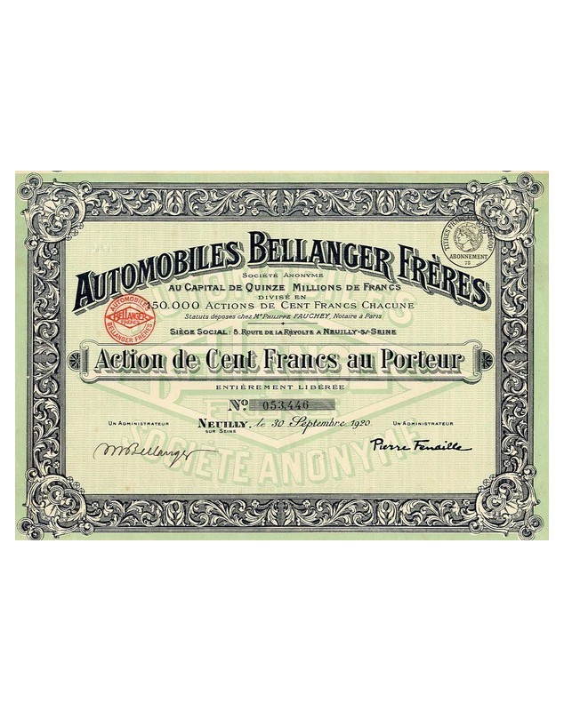 Share of 100 francs to bearer issued in Neuilly-sur-Seine near Paris, in 1920.