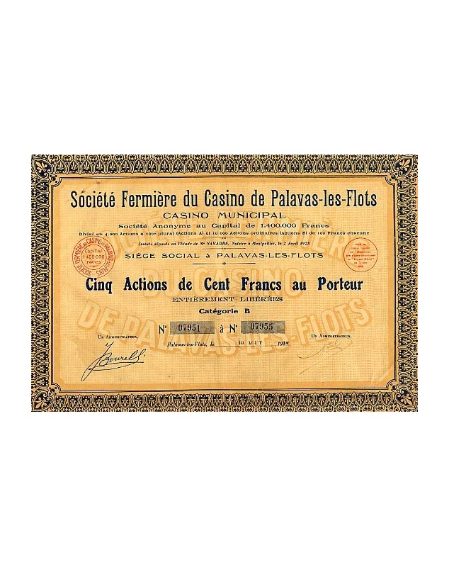 Cert. of 5 Shares of 100F - Palavas-les-Flots 1928