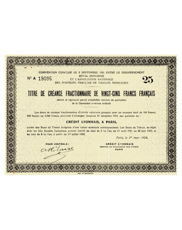 Convention entre le Gouvernement Royal Hongrois et l'Asso. des porteurs Français de Valeurs Mobilières