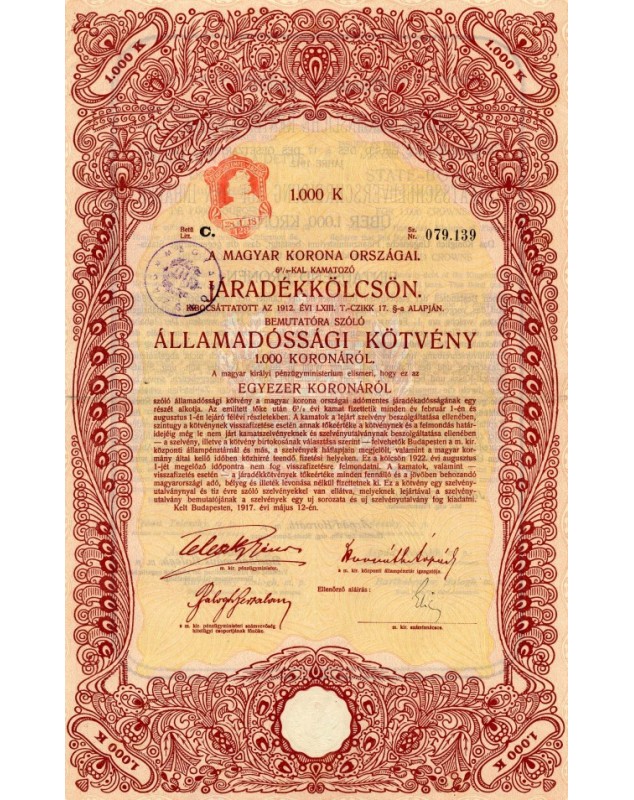 6% Bond of 1,000 Krowns to bearer issued in Budapest in 1917.