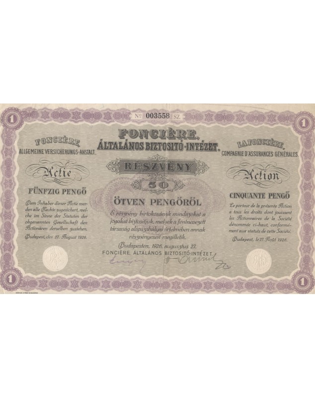 Share of 50 Pengo - Budapest 1926