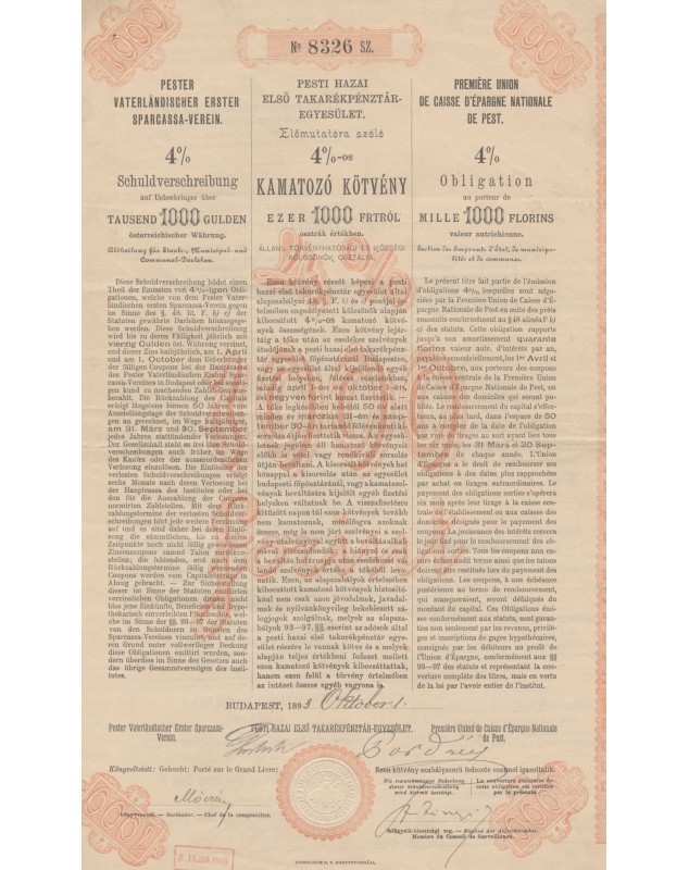 Pester Erster Väterländlischer Sparcassa-Verein 1000 Gulden