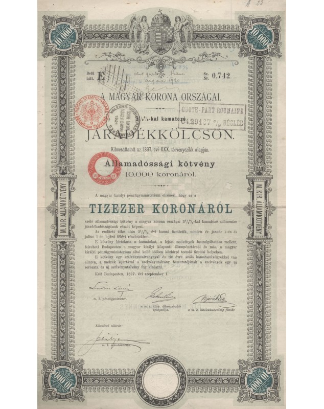 Royal Hungarian Bond 3,5% 1897, 10,000 Kr