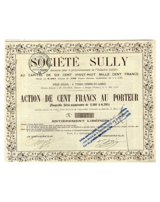 The object of the Société Sully is the milk industry, the improvement of the dairy industry, various scientific experiments, sterilization, pasteurization, the manufacture, conservation, reconstitution, sale and purchase of milk, butter, cheese and their products in their various forms, excluding casein, lactose, milk powders, milk residues and whey or using them.