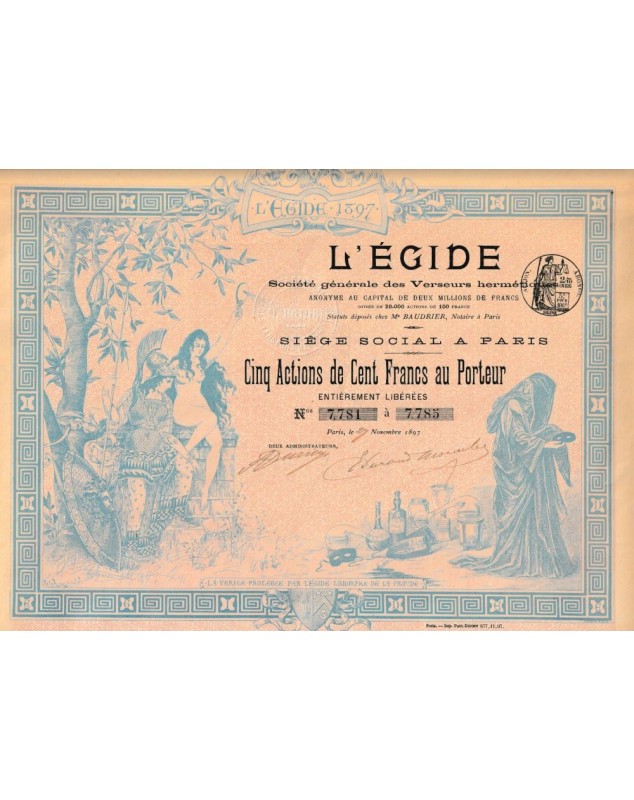 Cetificate of 5 shares of 100 francs each issued in Paris in 1897.