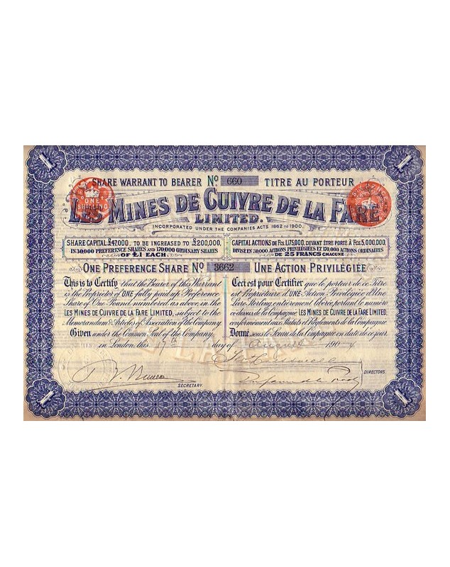 Certificate of 1 Preference Share of £1 issued in London in 1904.