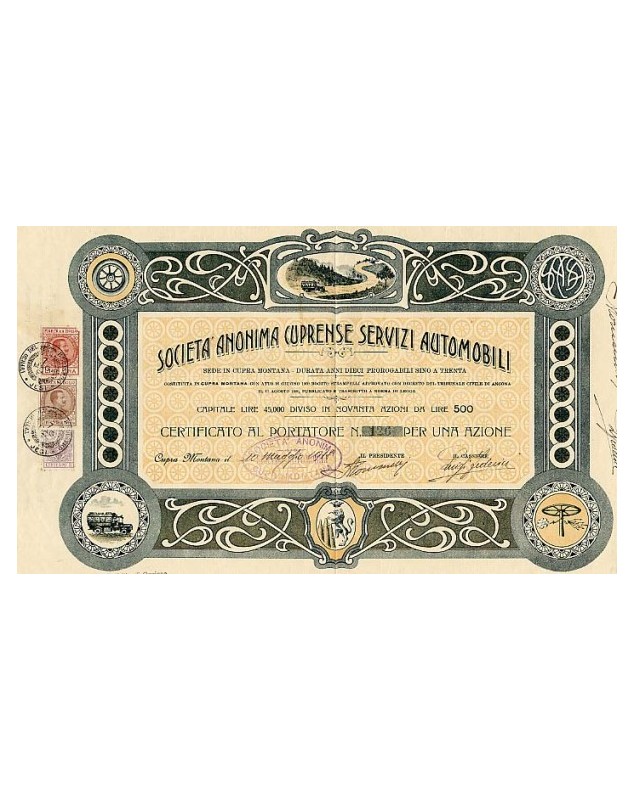 Design of automobiles, wheels and a lion in a vignette. Art Nouveau style.