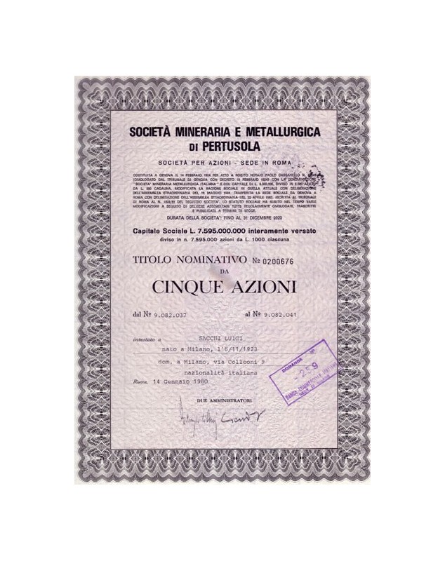 Cert. of 5 Shares of 1000 Lires ea. - Roma 1980