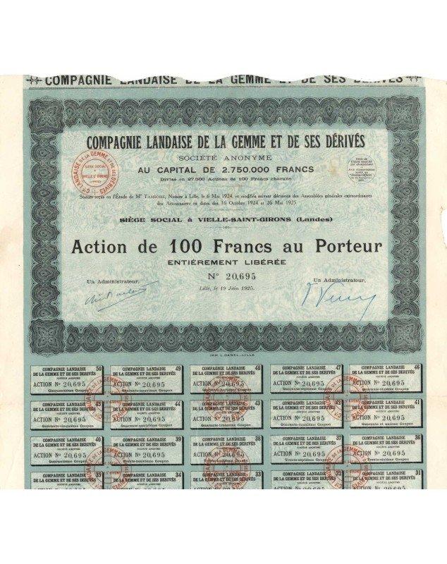 Share to bearer of 100 francs issued in Lille in 1925. (Compagnie Landaise of Resin and its Derivatives)