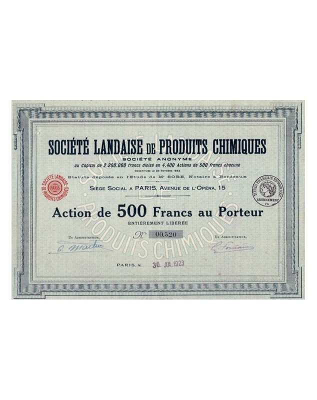 Bearer share of 500 francs issued in Paris in 1923 by the Landes Company of Chemical Products.