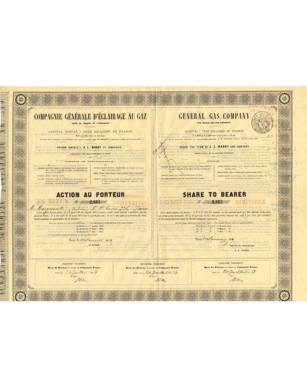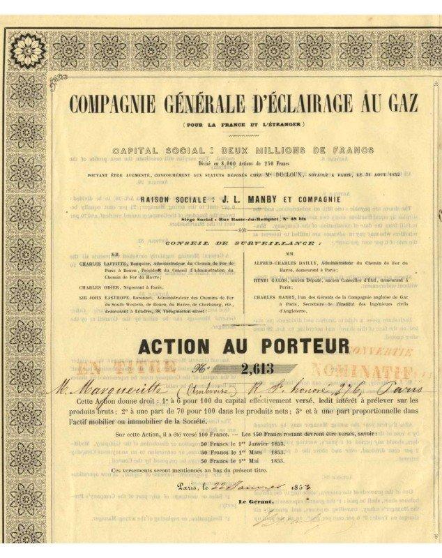 Registered share to Mr. Margueritte issued in 1853 in Paris by the Compagnie Générale d'Eclairage au Gaz (pour la France et l'Etranger) - Bilingual French/English bond.