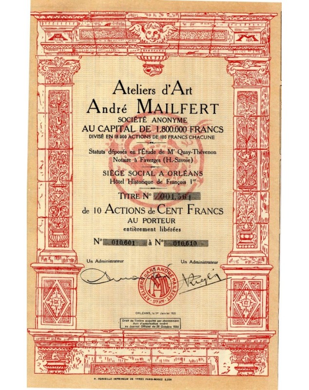 Certificate of 10 Shares of 100F - Orléans Hôtel de François 1er 1931