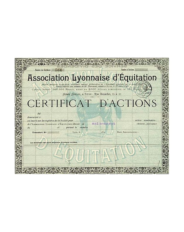 Share Certificate - Lyon 1893. Illustrated with a horse