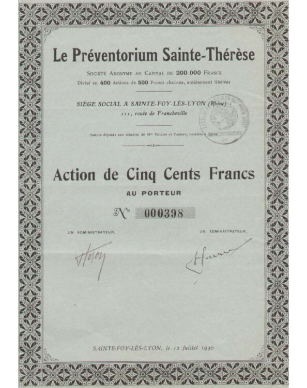 Share of 500F - Sainte-Foy-Les-Lyon (Rhône) 1930.