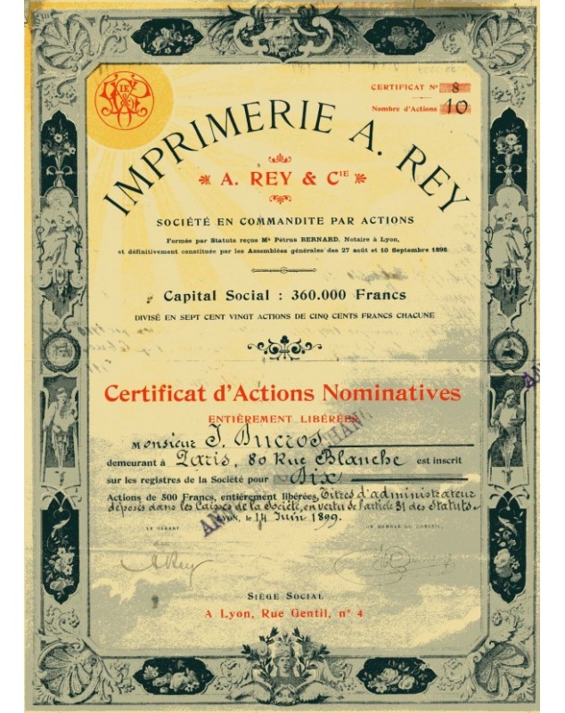 Lyonnaise printing house whose origins go back to the workshop of Simon Potin (1630-1719). The company took the name of Sté d'Imprimerie A. Rey in 1911, when Alexandre-Joseph Rey, son of the Lyonnais printer Joseph Rey and trained in Paris at the printing house of Charles Lahure then at the printing house of the Senate, In 1891 succeeded the company of the printer François Pitrat (1818-1893), then established rue Gentil, n ° 4.