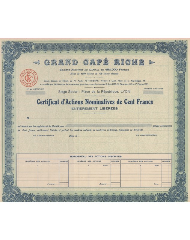 Certificat d'Actions Nominatives de 100F - Lyon. Unissued