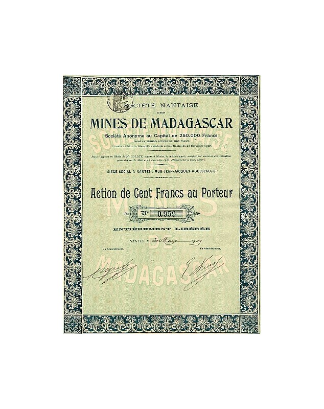 Share to bearer of 100 francs issued in Nantes in 1909.