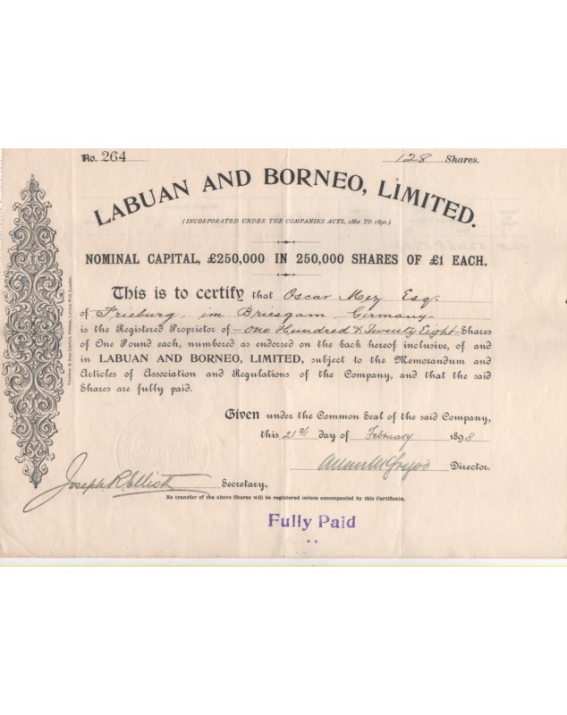 Certificate of 128 shares of 1£ each - Borneo/london 1898