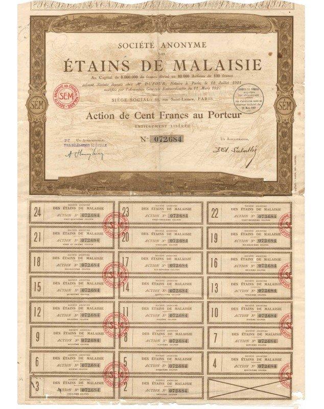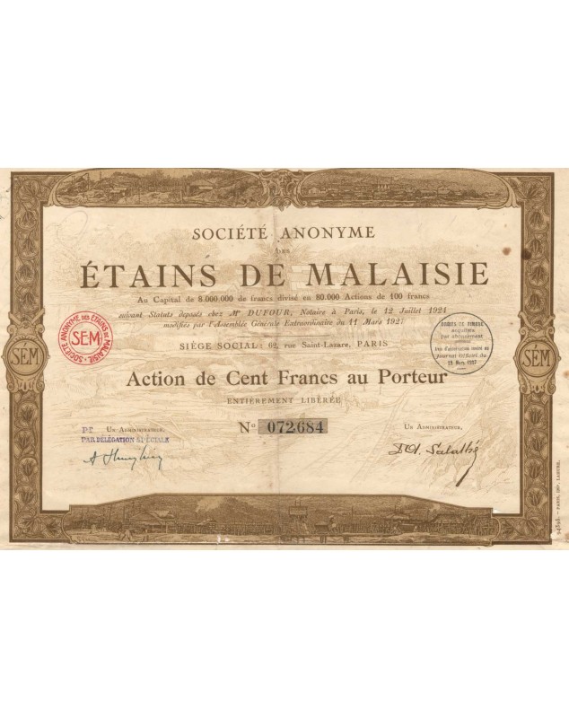 In 1909, the company's headquarters moved to 62 rue Saint-Lazare. A new Société Anonyme des Etains de Malaisie was founded in 1924 with a capital of 4 million francs, increased to 8 million francs in 1927 by the creation of 40,000 new shares.