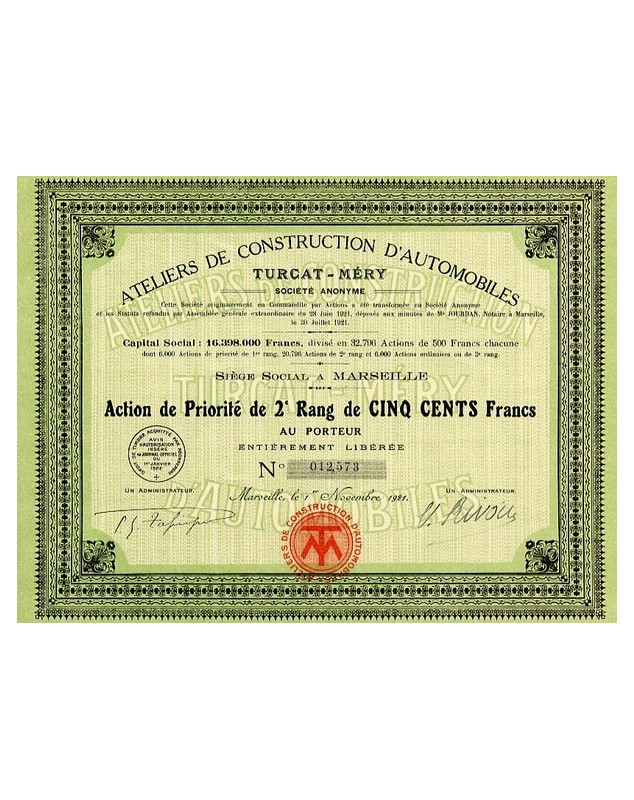 Bearer priority share of 500 francs second rank issued in Marseilles in 1921.