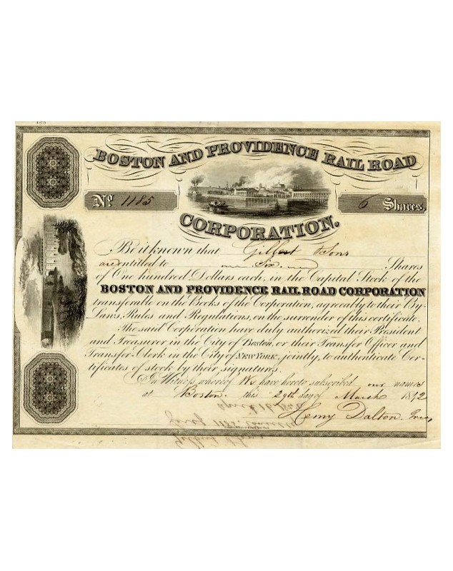Certificate of 6 shares of 100$ ea. Boston 1842