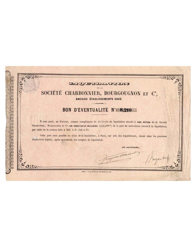 Liquidation de la Société Charbonnier, Bourgougnon et Cie, Anciens Etablissements Cavé